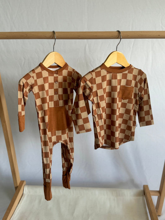 Chocolate & Tan Checkered Pocket Long Sleeve
