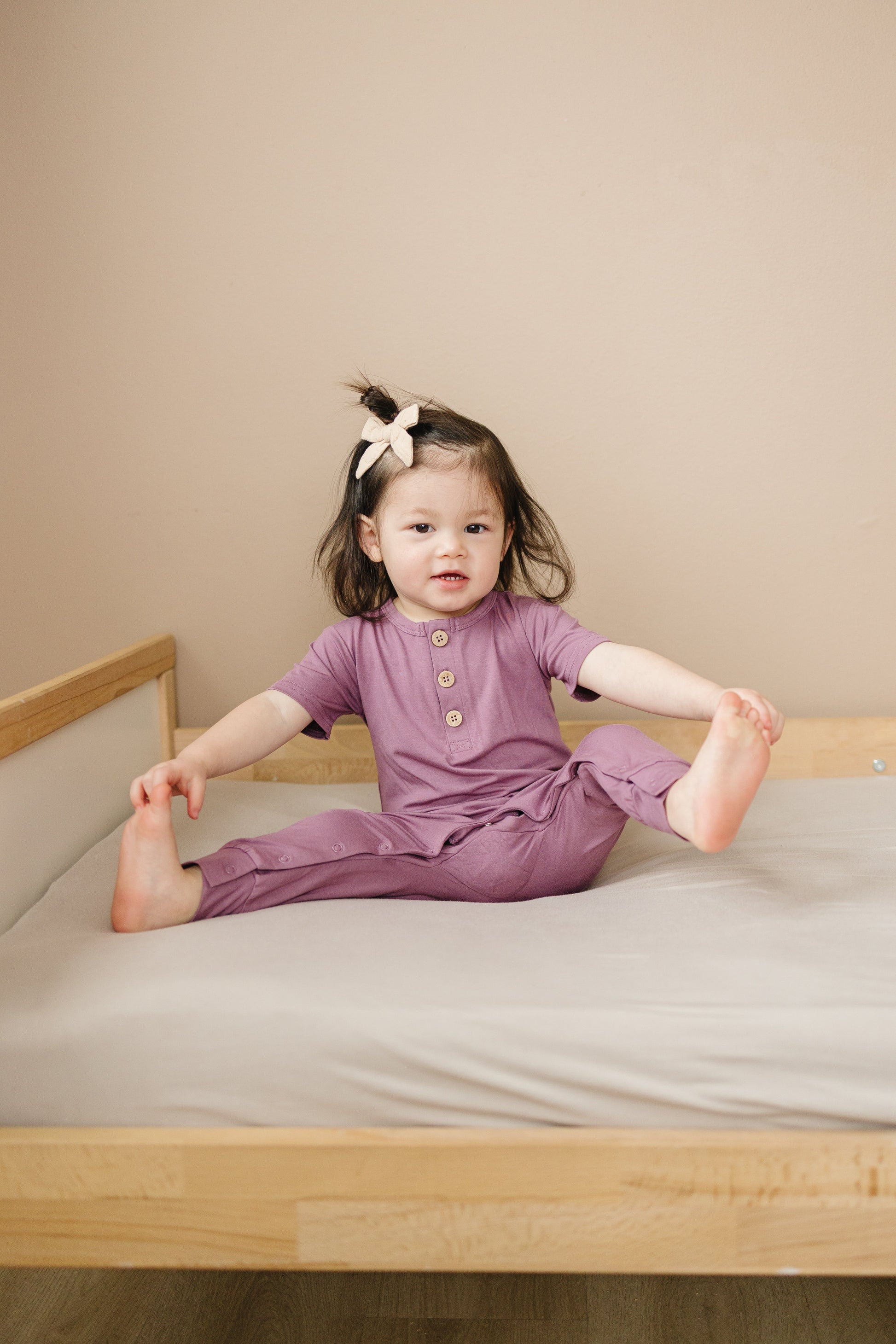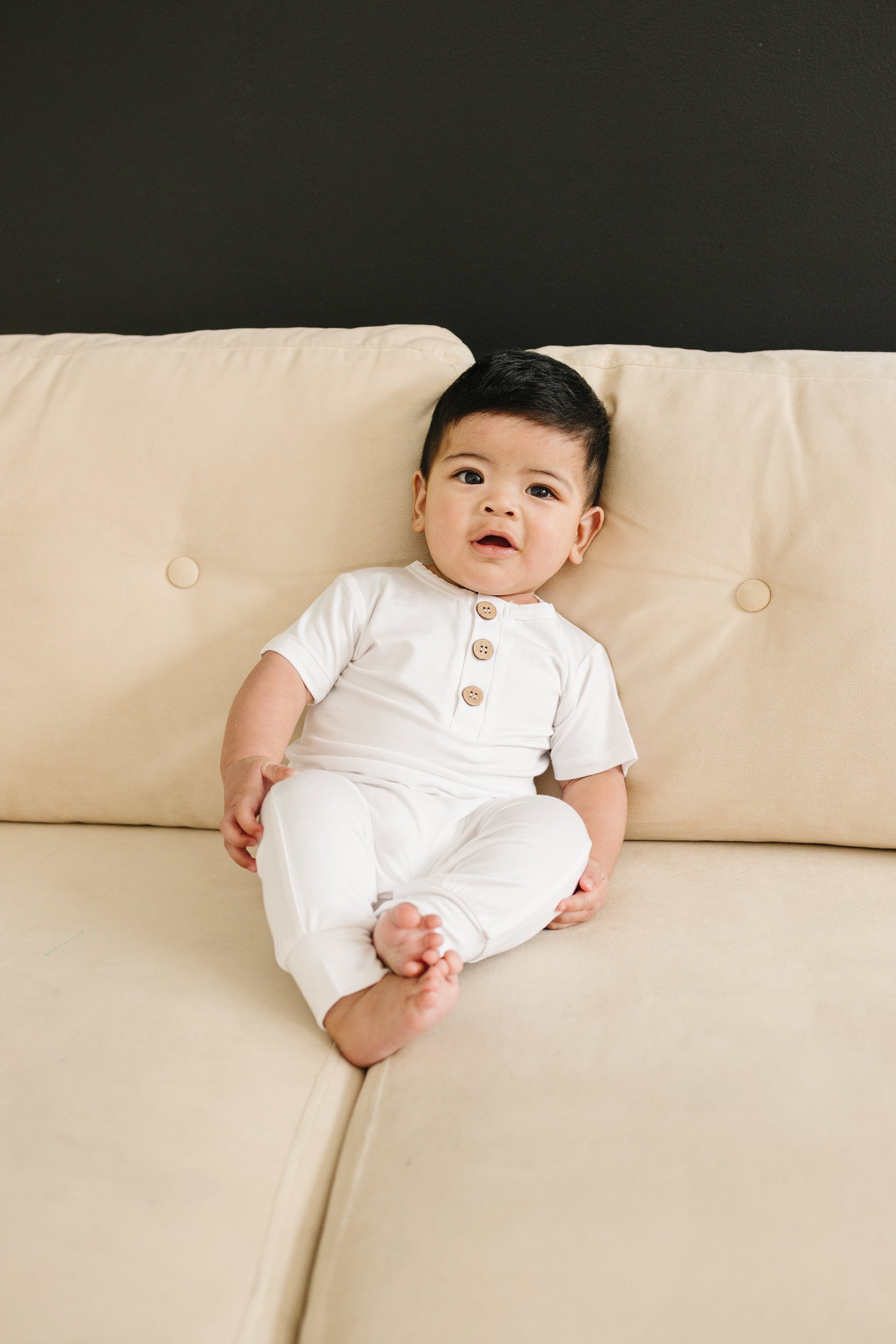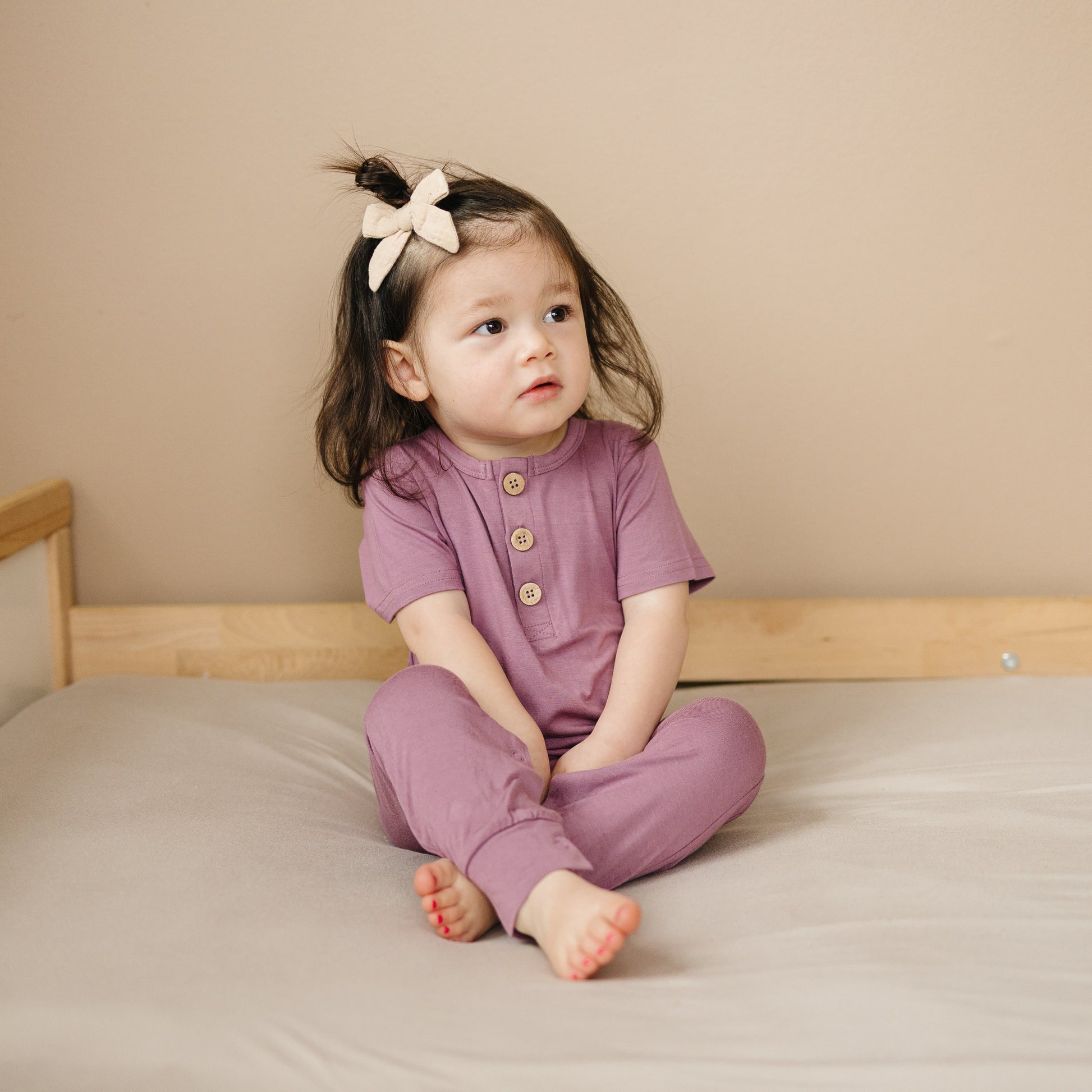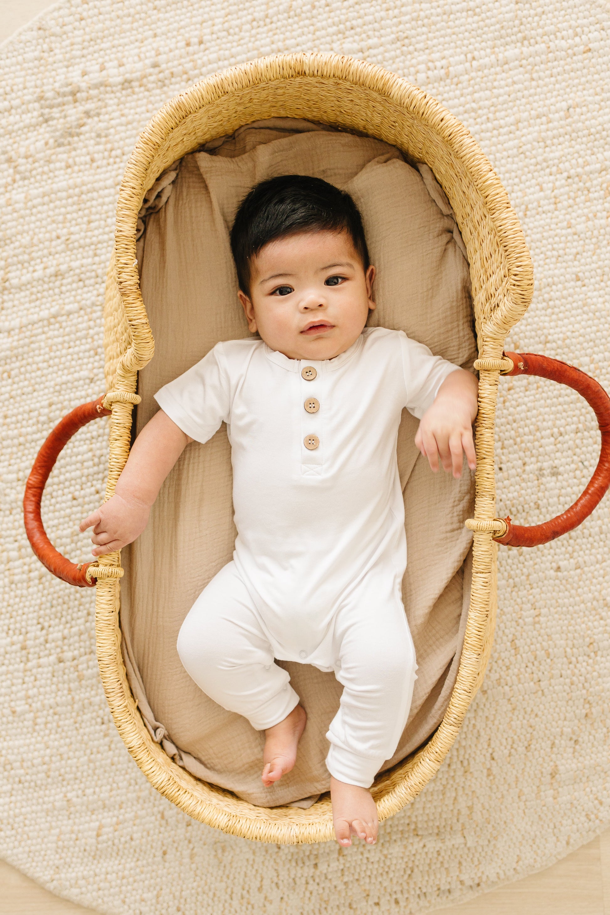 Introducing our Short-Sleeved Bamboo Henley Romper, where comfort meets style. Available in five colors and sizes 0-3 to 18-24 months, this romper is crafted from 94% bamboo viscose and 6% spandex. It runs true to size, featuring a three-button Henley neckline for easy dressing and convenient snaps at the crotch for diaper changes. Durable and soft at 220gsm, this romper is perfect for any occasion. Order now for a stylish and comfy addition to your baby's wardrobe!