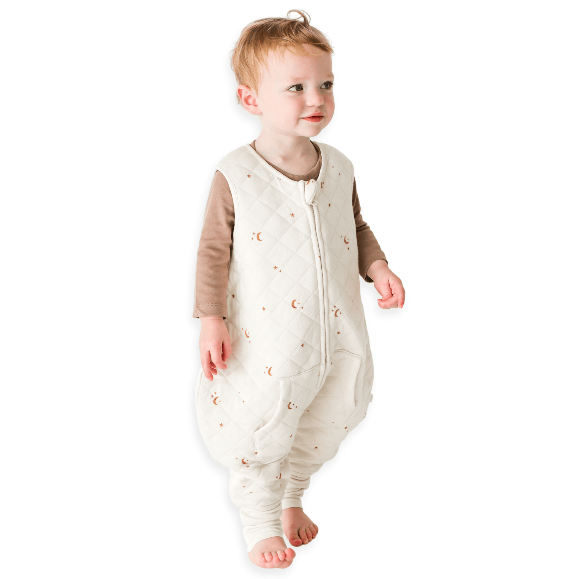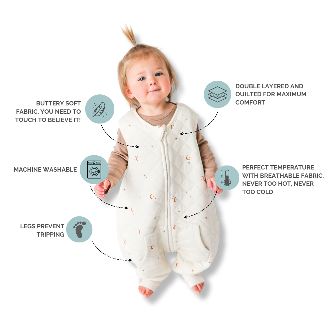 Toddler sleep sack with feet. A unique sleep bag with legs designed for active babies and toddlers, early walkers who trip and fall in their traditional sacks, and blanket kickers who wake up from the cold at night.