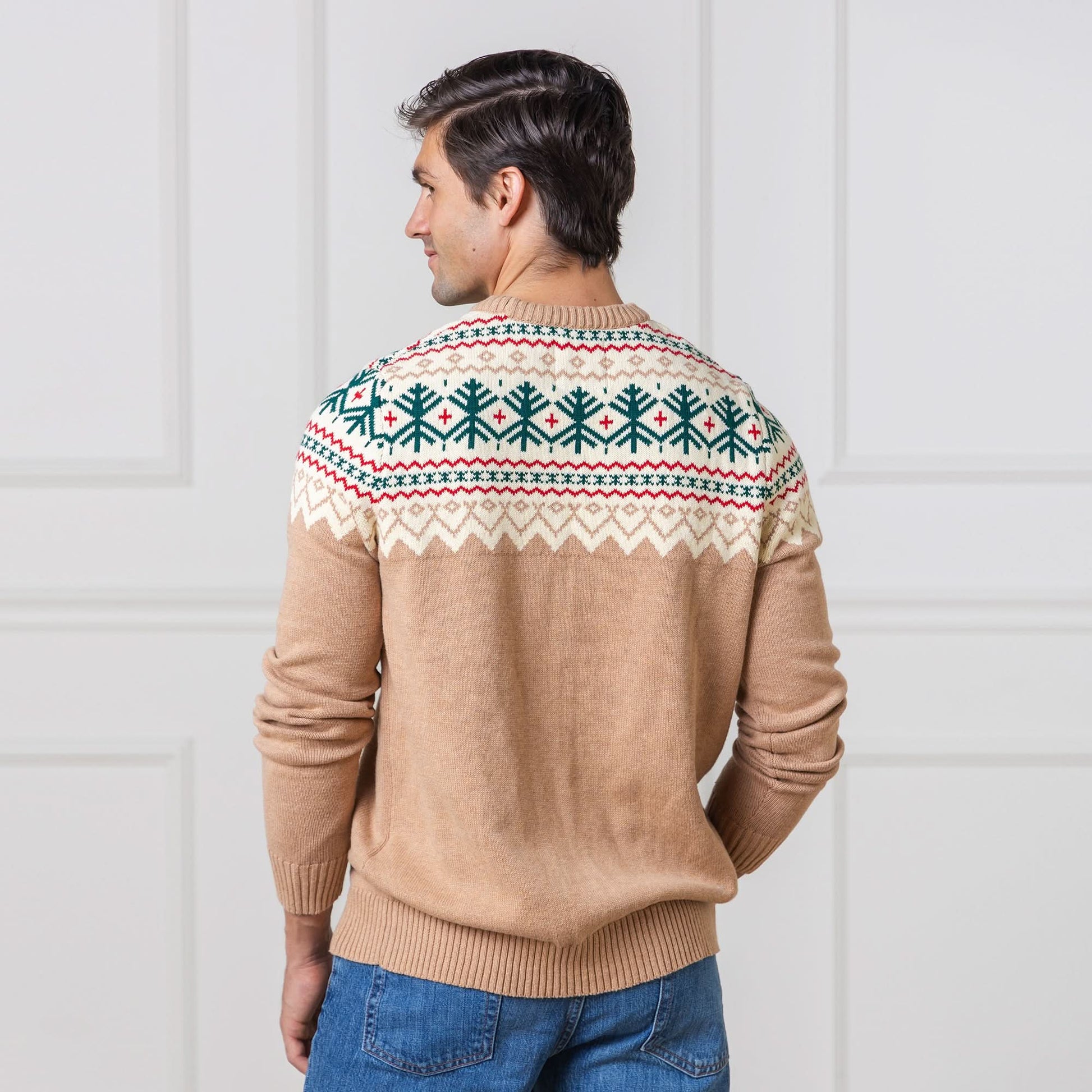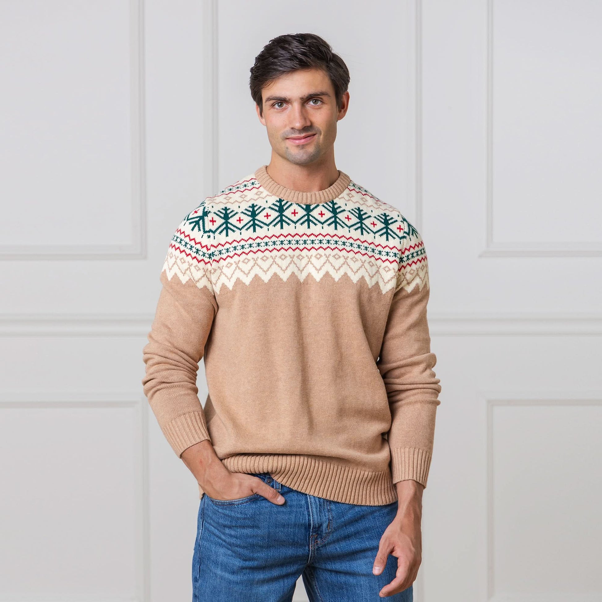 Our stylish crew neck pullover sweater is crafted in soft organic cotton to keep you warm all season long. Features a striking fair isle intarsia design at the shoulders and rib knit trim at the cuffs and collar. Pairs perfectly with our collection of organic cotton button downs.
