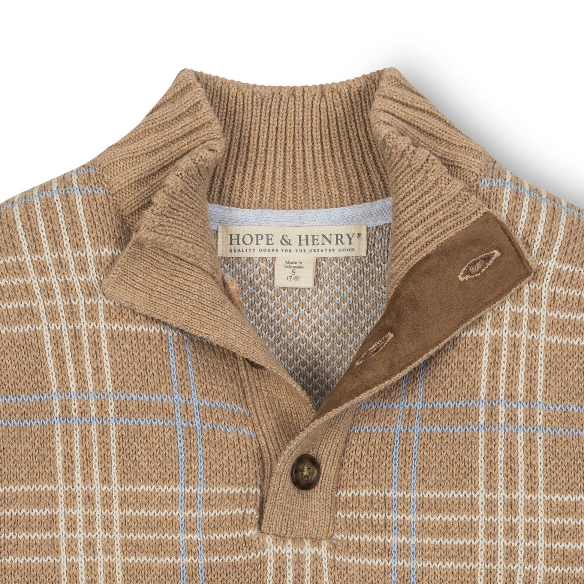 Our plush mock neck sweater in soft organic cotton lends an instantly polished look to your boy for all the activity that cool weather brings. Features a beautiful intarsia design, rib trim, and a button placket with faux suede detail. Pairs perfectly with our collection of organic cotton button downs for a complete look.