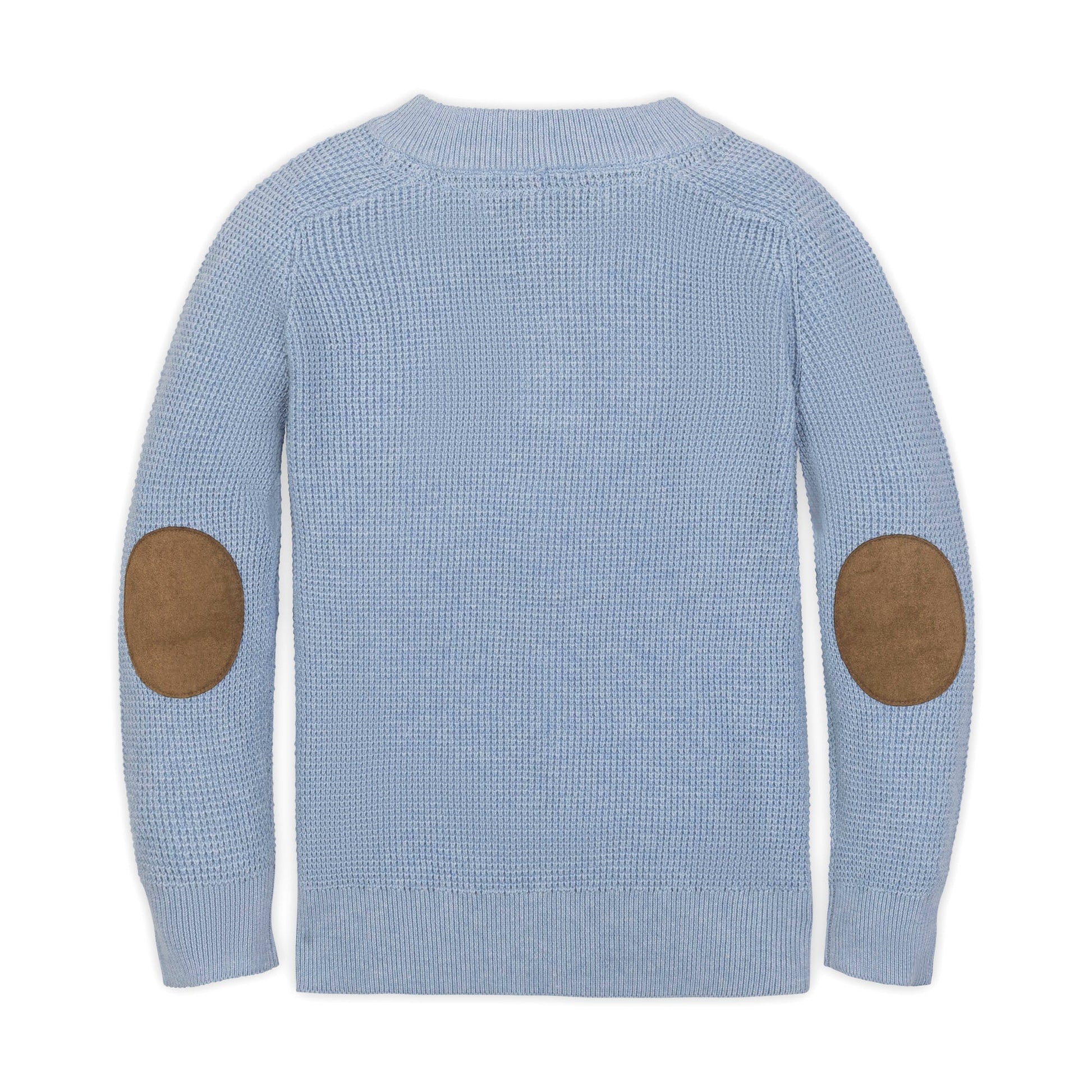 Our long sleeve sweater henley in soft organic cotton waffle knit combines the sporty look of a henley with the coziness of a sweater for the ultimate in comfort and style. Features faux suede elbow patches, button closure at the center front placket, and rib trim at the cuffs and collar. A sophisticated twist on a classic.
