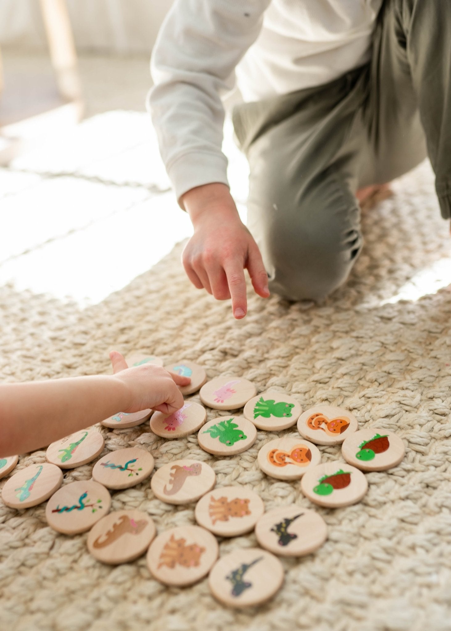 Be as cool as a reptile with this matching game! Your next adventure is just a slither away with our Reptile Matching Tiles. This memory matching set consists of 12 cute and crawly reptile designs on 24 wooden tiles. It can be enjoyed solo or with the entire family - teaching kids to take turns and share with others. Our wooden matching tiles will also promote short term memory skills.