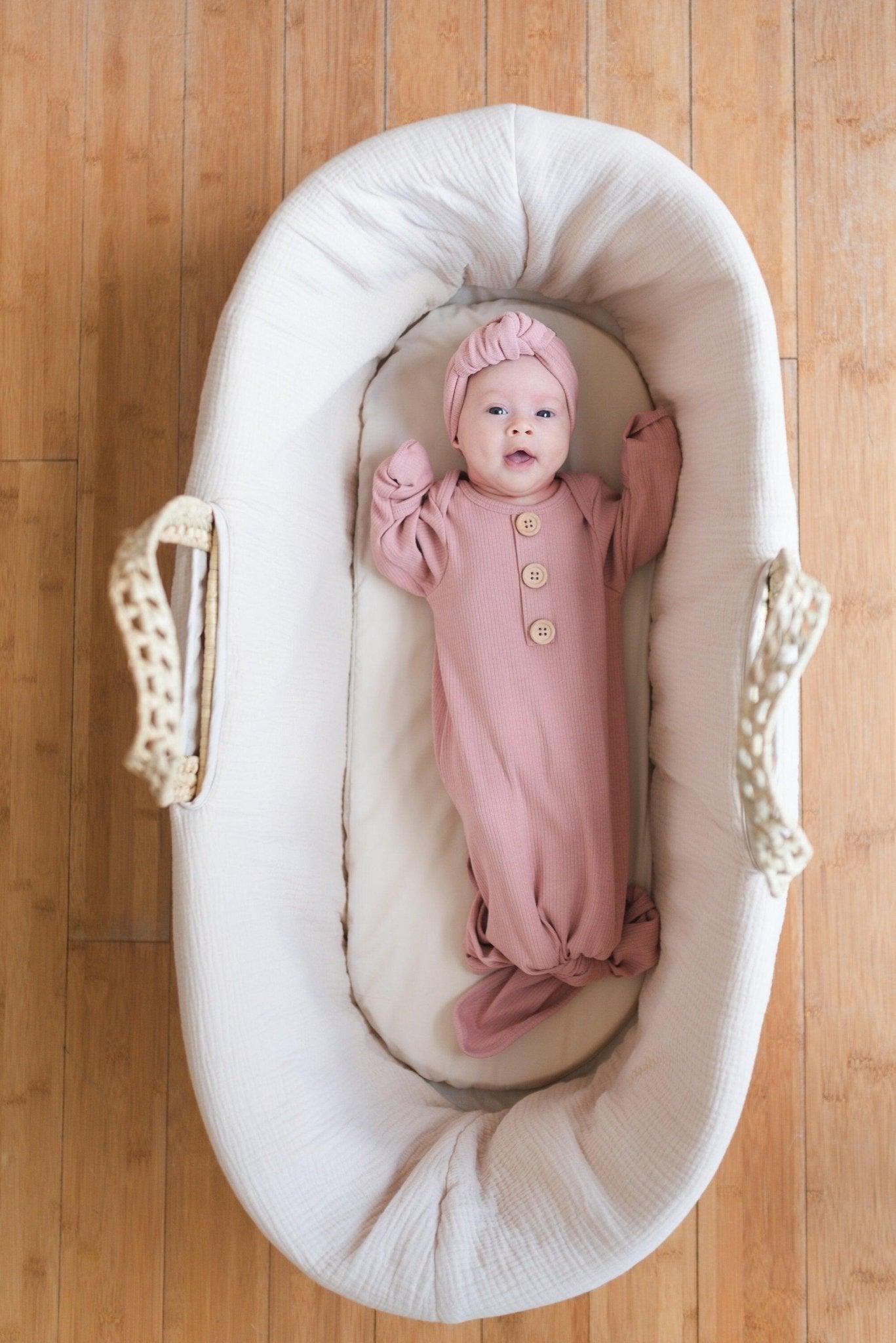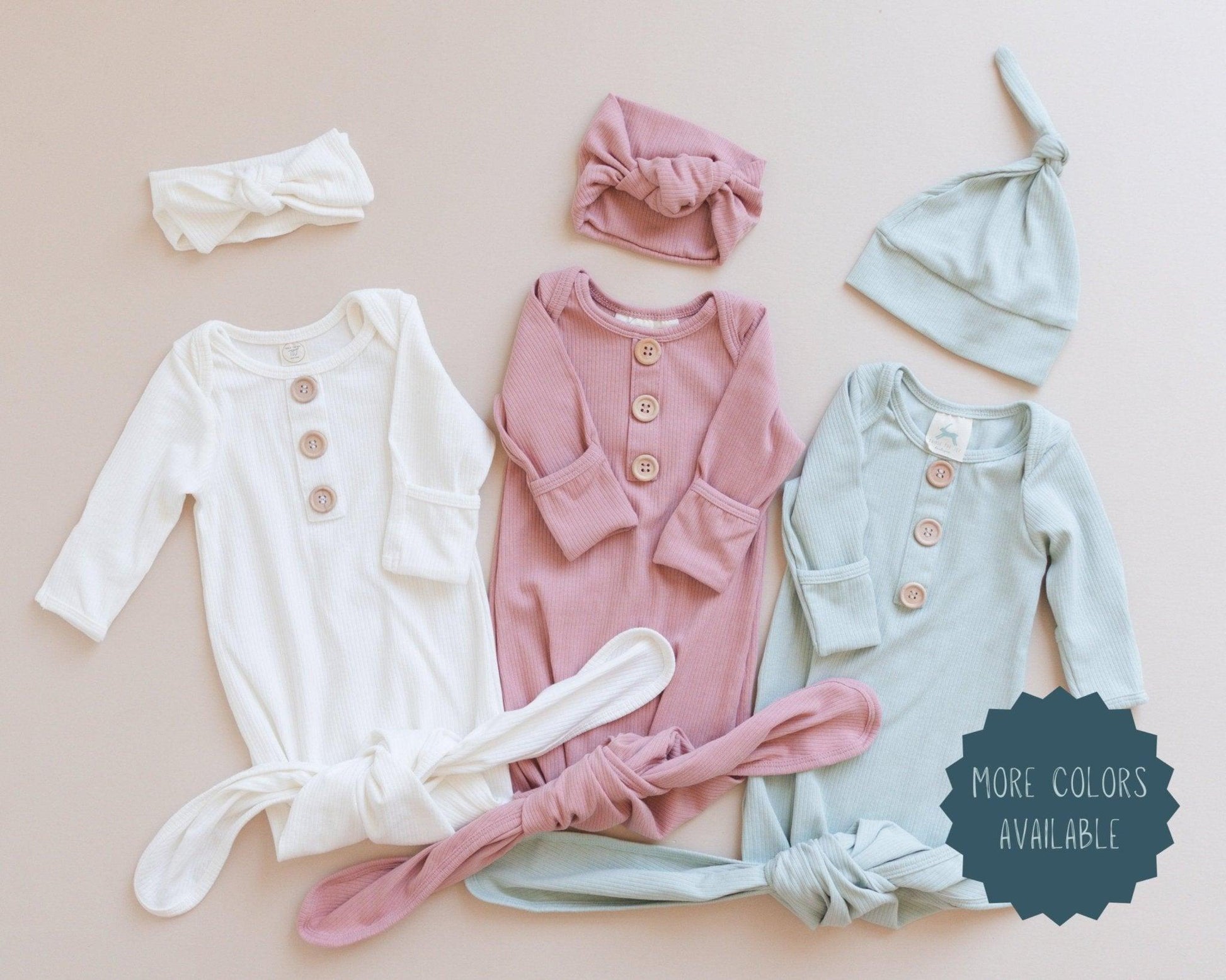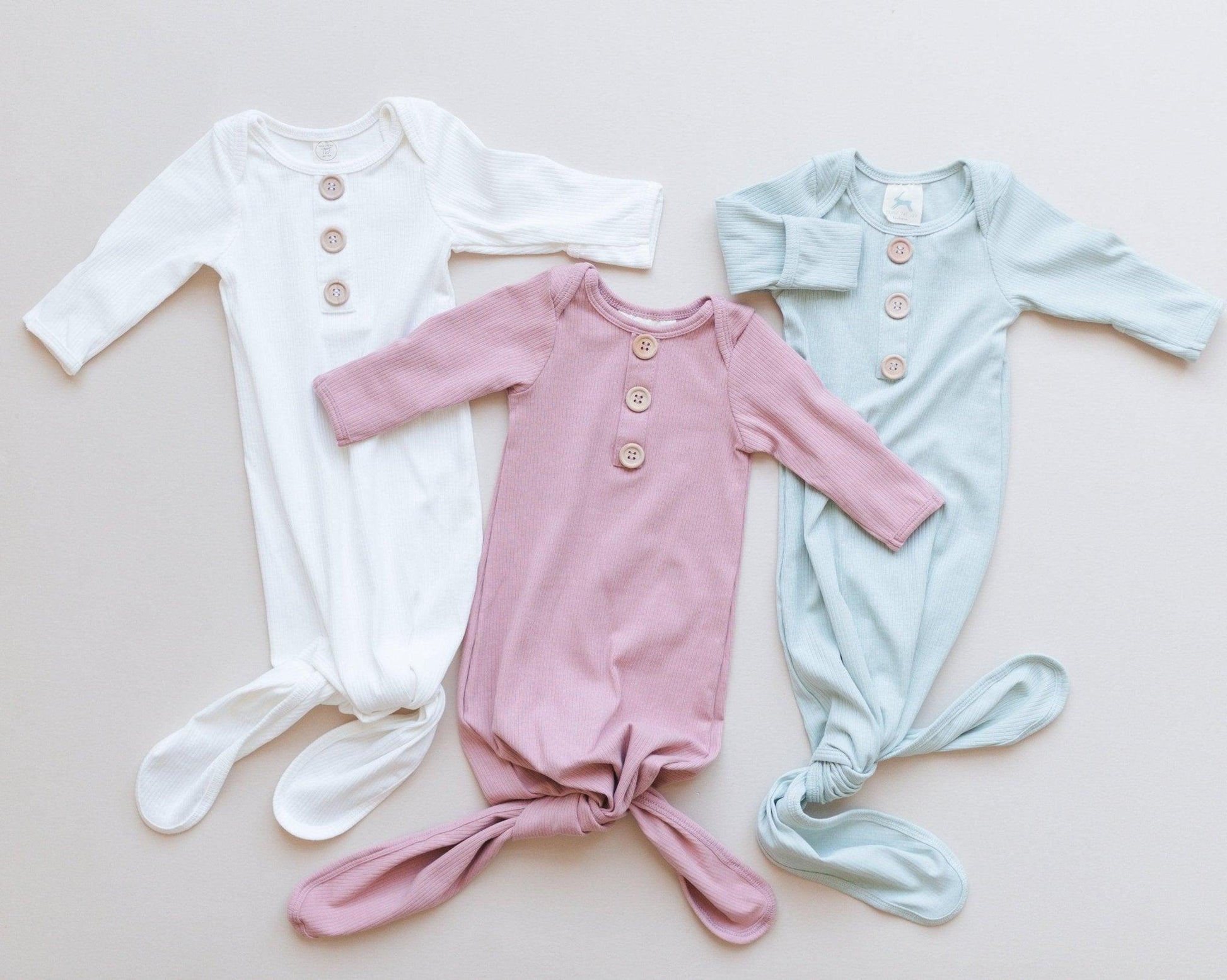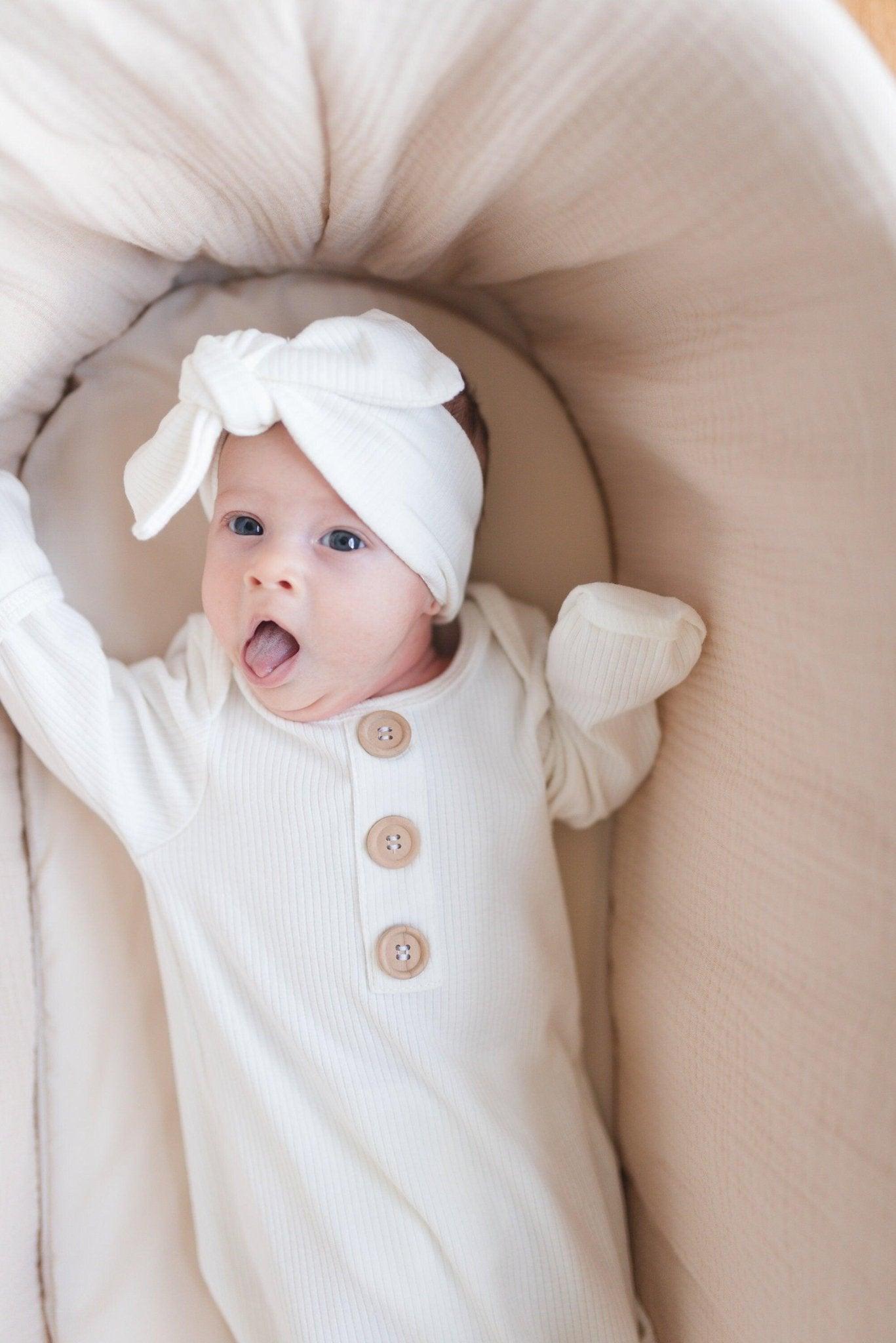 Ribbed knotted henley-style baby gown. Cotton. Knots easily at the bottom for easy, quick diaper access. Foldover mittens at cuffs. Newborn size. Matching hats and headwraps available, sold separately.