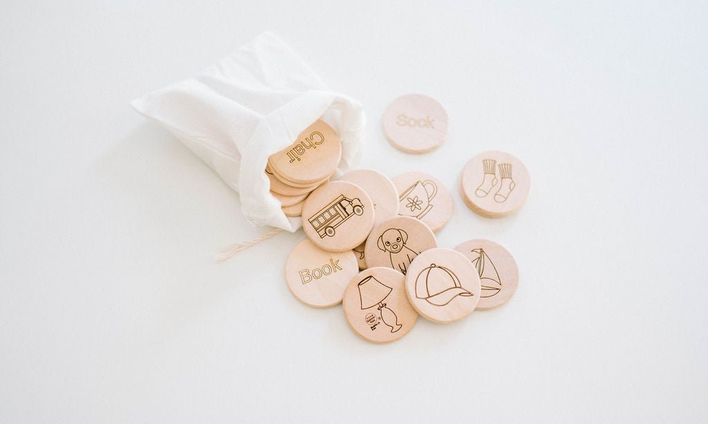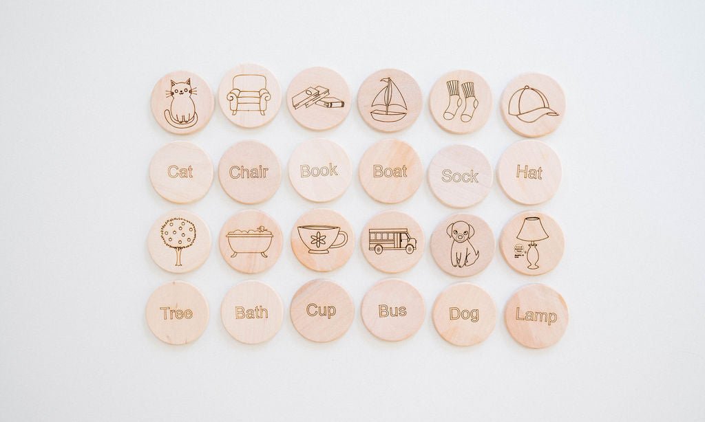 Memory matching tiles are a timeless classic that never goes out of fashion! It can be enjoyed solo or with the entire family - teaching kids to take turns and share with others. Our wooden matching tiles will also promote short term memory skills. This set features 12 sight words and corresponding pictures on 24 wooden tiles. Tiles include a Chair, Hat, Bus, Boat, Sock, Tree, Bath, Cat, Dog, Cup, Lamp and Book. Help your child match the word with the picture and encourage not only spelling but also sight words. Great for toddlers through early elementary school age.