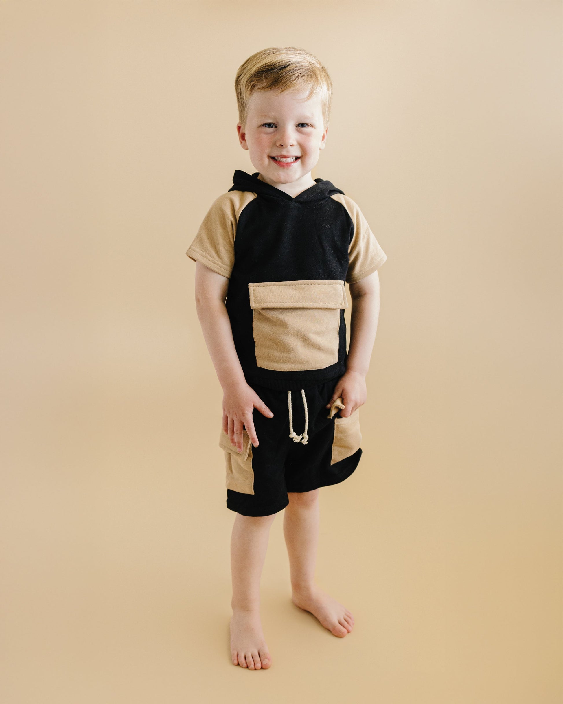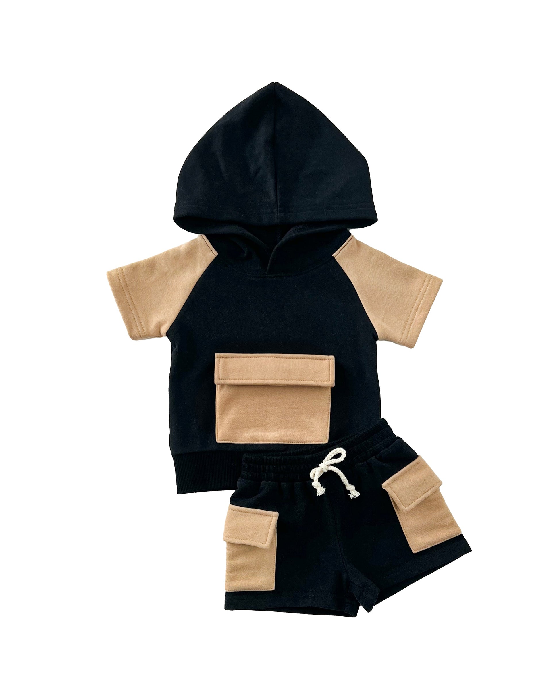 The Terry Cargo Shorts Set in Black & Tan combines sleek, neutral tones with luxurious comfort, making it perfect for both the transitional spring weather and the warmth of summer. The lightweight French terry fabric keeps your little one cool, while the hooded top with a front pocket and cargo-style shorts with spacious pockets bring a functional, stylish edge. Available in 5 colors, this set is perfect for sibling matching, giving your family a coordinated look!