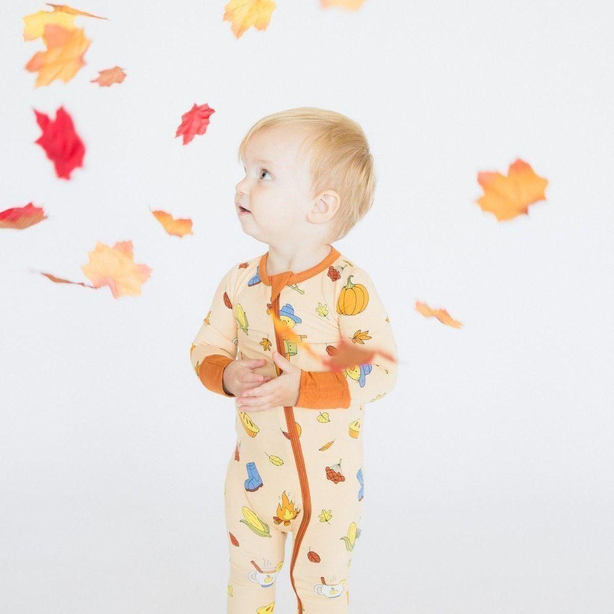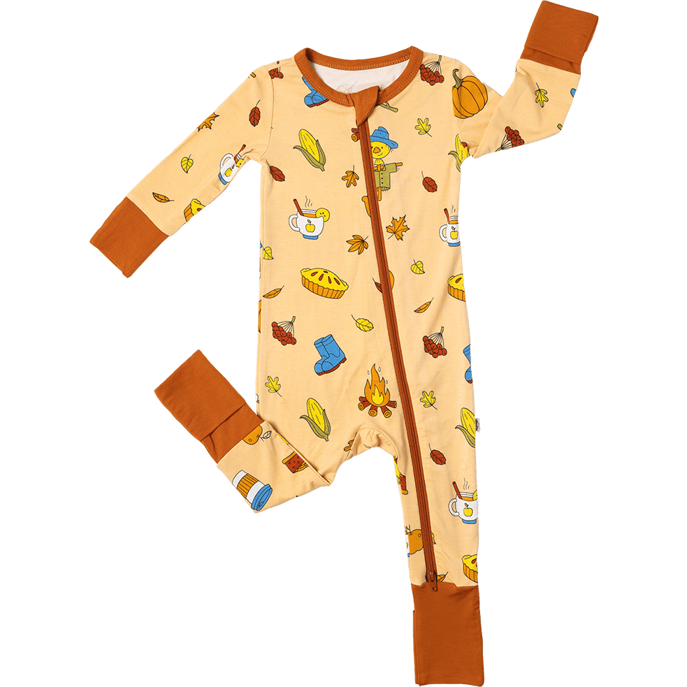 Cozy comforts in vibrant fall colors await your little one in this bountiful harvest. Autumn elements like pumpkin-spiced coffee, scarecrows, and bonfires are neatly arranged on a warm, neutral fabric.