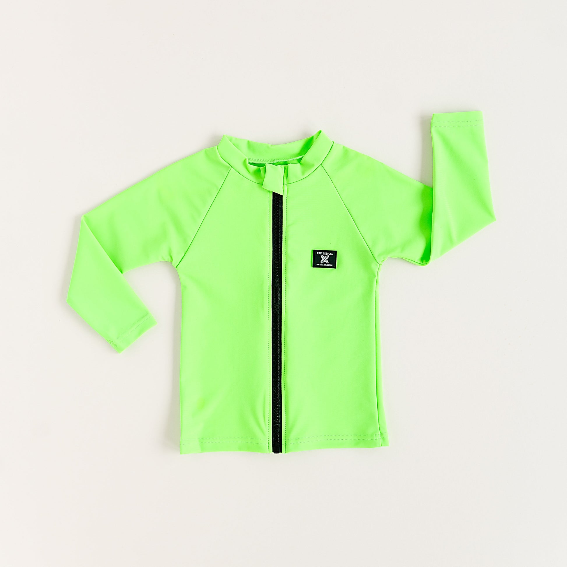 A parent’s favorite, Rad Toddlers ultra-bright neon green rashguard shirt with a convenient front zipper for easy on/off, even when wet. Features 50+ UPF sun protection in soft, stretchy fabric that moves with your active toddler. The high-visibility neon color helps you spot your child instantly at busy beaches and pools.